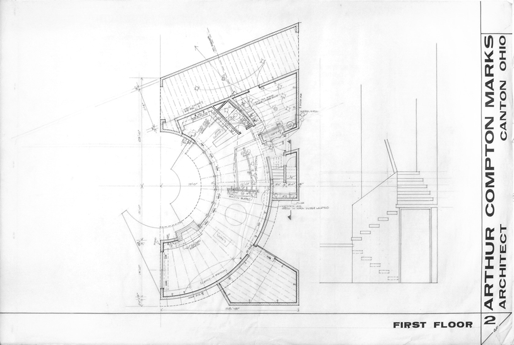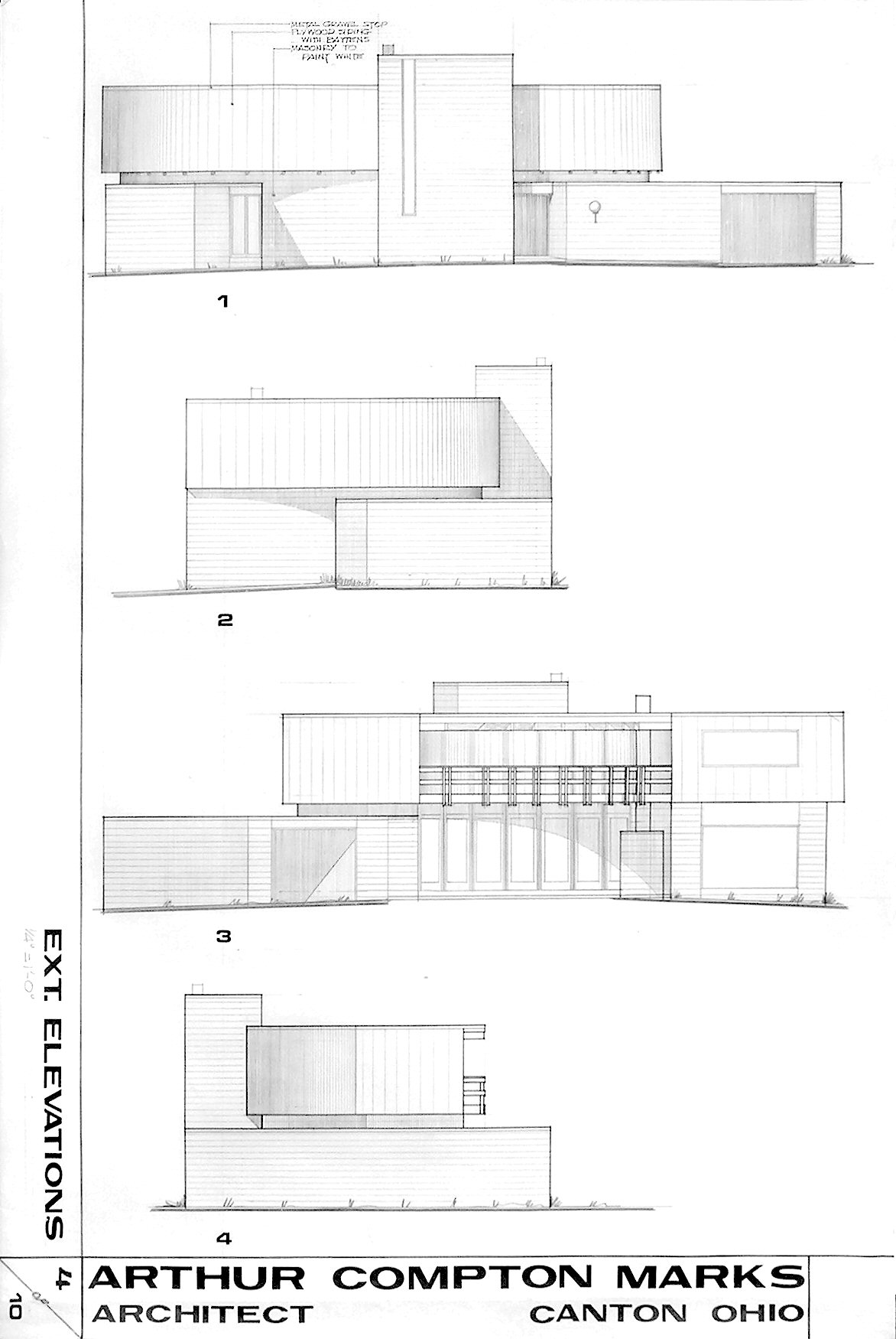 The entry foyer and hall led to the formal dining and living room—that is, until the office took over. At the time of the library project there were two drafting tables for Marko and John Worstell, his chief draftsman, and a desk for Theadora, the secretary, all in the den. Three more drafting tables and architects were moved into the living room. Eventually Marko moved the office out and it became a "normal" house again.