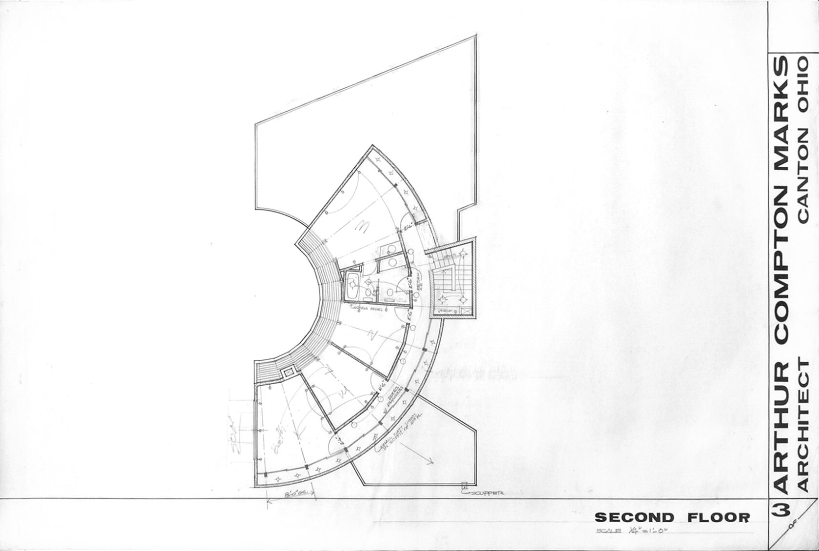 The brick is structural, not the finished 4" veneer attached to stud walls type of brick most people are used to seeing. The brown-stained wood is cedar plywood with battens for the seams and nail lines. An old natural gas well centered the patio and the "semicircle"—which overhangs both sides of the first floor. On the street side of the overhang are the upstairs closets and down lighting for the front facade. On the south side, the balcony and the roof overhang providing passive solar heating by shading the tall windows in the summer while letting the lower winter sun shine deeply into the house. The 3"x10" and 3"x12" timbers of the circular structure were exposed with tongue-and-grove decking for the ceilings.